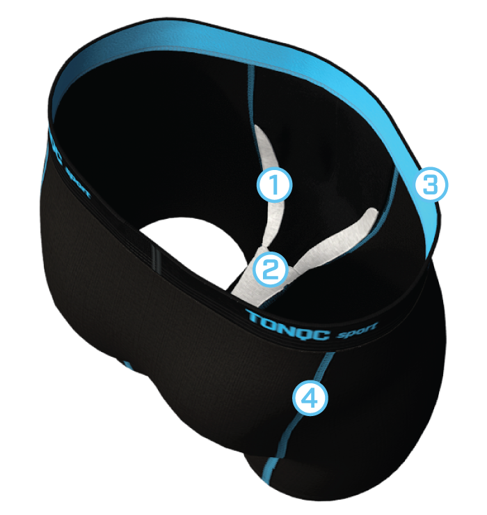 Tous les boxers sont munis du système breveté TONQC®, avec un design ergonomique muni de coussinets de tissu maillé 3D, pour un soutien maximal, plus d’aération et éviter les frottements avec la peau.